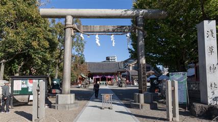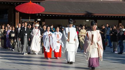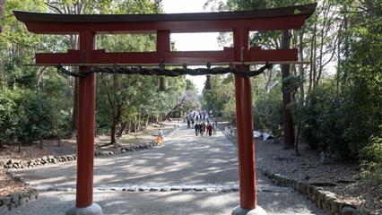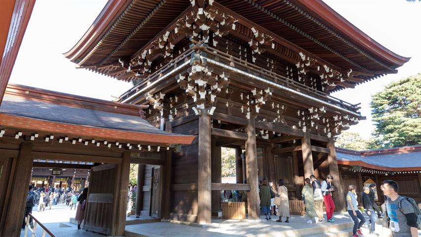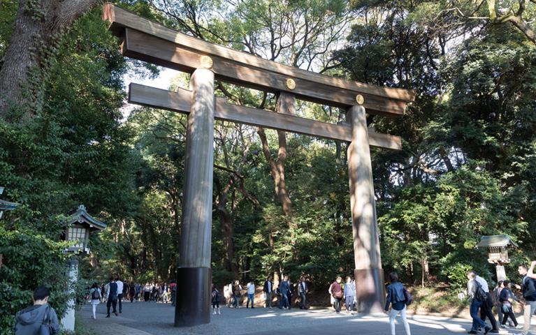 L'accès au Meiji-jingu le sanctuaire dédié à l'empereur Meiji (Mutsuhito) et à son épouse l'impératrice Shoken, au milieu d'un parc boisé de 70 hectares et plus de 170 000 arbres s'ouvre par un tori immense en cyprès taïwanais qui s'élève à 12 mètres de haut. C'est un des lieux de culte shintoïste les plus célèbres du Japon, et un lieu priviligié de promenade pour les tokyoïtes.