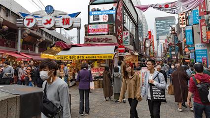 Retour à Ueno ce quartier populaire, grouillant de monde, aux rues bondées, aux innombrables magasins et boutiques diverses du marché d'Ameyoko. Une destination prisée des tokyoïtes le week-end. Le parc principal Ueno-koen abrite la plus forte concentration de musées de la ville et en particulier le musée national de Tokyo qu'il faut absolument aller visiter pour admirer la plus belle collection d'oeuvres d'art, d'objets divers japonais, surtout ne pas manquer la galerie des trésors de Horyu-ji avec ses masques, peintures sur rouleaux et autres statues de Bouddha. Visiter aussi le Ueno Tôshô-gû un sanctuaire dédié à Ieyasu Tokugawa le seigneur de guerre qui unifia le Japon. A voir l'étang Shinobazu où se réfugient des dizaines d'espèces d'oiseaux.