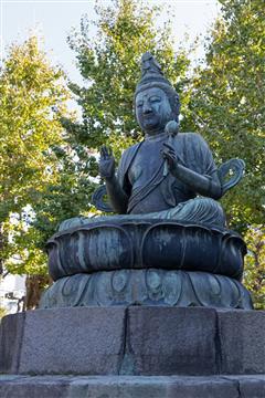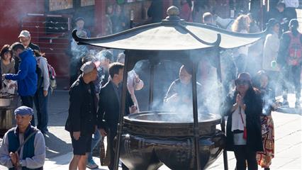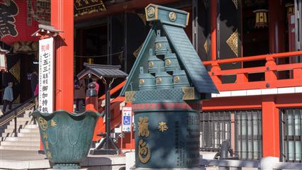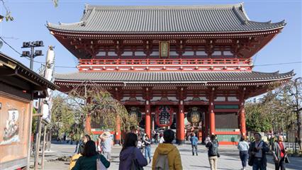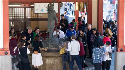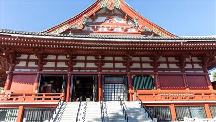 Le chemin pour se rendre au temple Sensô-ji situé dans le quartier d'Asakusa passe d'abord sous une porte monumentale sous laquelle pend une grande lanterne en papier. Probablement le plus ancien des temples de Tokyo. Fondé en 628 après que des pêcheurs auraient ramené dans leur filet une statuette en or de la déesse Kannon Sumida. Face au bâtiment principal le brûleur d'encens attire un grand nombre de pélerins qui tentent par une gestuelle de grands mouvements des bras d'attirer vers eux les fumées d'encens pour leurs valeurs curatives. A proximité du temple principal s'élève un sanctuaire shintoïste (Asakusa-jinja) érigé en 1649 en hommage aux pêcheurs qui avaient pêché la statue de la déesse Kannon. C'est de ce sanctuaire que le 3ème week-end de mai deux millions de personnes assistent au Sanja matsuri qui est dédié aux trois pêcheurs à l'origine du sanctuaire, des centaines de bénévoles en costumes traditionnels portent, en poussant force hurlements et chants puissants, de lourds et volumineux palanquins.