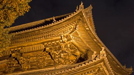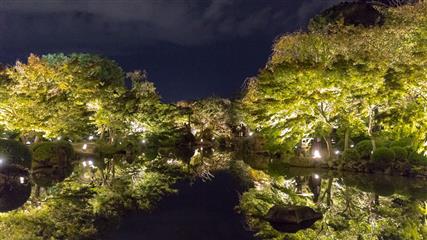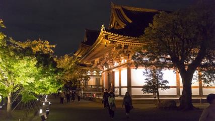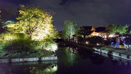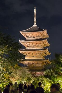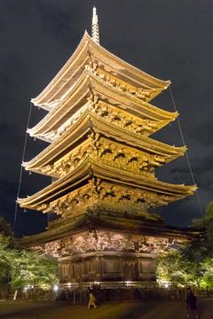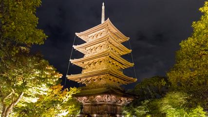 Le jardin du Tô-ji illuminera notre dernière soirée à Kyôto. En effet à compter du 26 octobre (et pour une quinzaine de jours) le jardin est illuminé de milles feux et met particulièrement en valeur le plan d'eau et en vedette la pagode forte de ses 57 mètres de hauteur (pagode la plus haute du Japon).