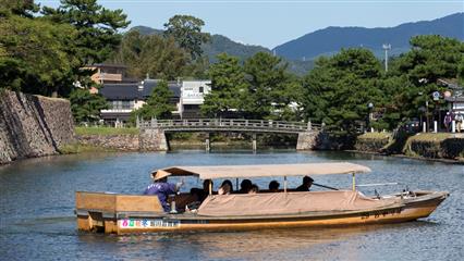 28 octobre : La cité de Kurayoshi à 40 kilomètres de Tottori est sur la route du mont Daisen (1709 m) montagne sacrée pour les ascètes des temps anciens. Kurayoshi grande cité de l'époque Nara, cité marchande et artisanale dès le XVème siècle, les bâtiments construits au fil des siècles le long de la petite rivière Tamagawa sont connus sous le nom de "shirakabe dozôgun akagawara", signifiant littéralement "groupe d'entrepôts aux murs blancs surmontés de tuiles rouges". À l'origine, ces entrepôts construits durant les périodes Edo (1603 - 1868) et Meiji (1868 – 1912) avaient pour fonction de recevoir des marchandises telles que le soja ou le sake. Un air d'ancien Japon persiste encore ici et on déambule au milieu de salons de thé, de galeries d'art, d'ateliers d'artisans, de cafés qui ont investi ces anciens entrepôts. Dans le canal bordé de maisons blanches, enjambé de ponts de pierre, nagent les célèbres carpes rouges et noires koï. Ce quartier n'est pas très étendu, il se visite facilement à pied. Ne manquez pas l'atelier de cerf-volant Kurayoshi-ika où se perpétue la fabrication traditionnelle de ces engins volants. "Calamars volants" est la traduction littérale de kurayoshi-ika, ils sont construits en forme de losange selon un plan incurvé, les ailes sont ornées de dessins multicolores.