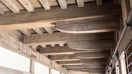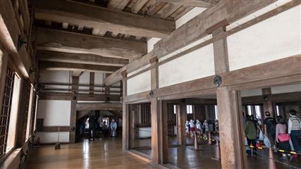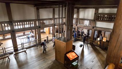 La visite du bâtiment se fait selon un circuit fléché précis et débute par un chemin qui parcourt de nombreuses portes, des escaliers aux marches abruptes, de couloirs défensifs pour déboucher sur une vaste esplanade plantée de nombreux cerisiers et de pins. L'étape suivante mène au célèbre donjon, une tour haute de 46 m reposant sur un soubassement de pierres cyclopéennes. A l'intérieur pour grimper au plus haut des étages, la montée se fait par l'intermédiaire d'escaliers raides et sombres. La structure est constituée de gigantesques troncs de cyprès dont le diamètre peut approcher les un mètre de diamètre, le plus ancien aurait 780 ans. La plupart des étages sont vides mais la superbe structure en bois à elle seule est superbe. Il y a quand même quelques armes (sabres et fusils) et armures exposées.