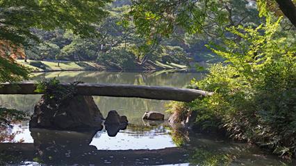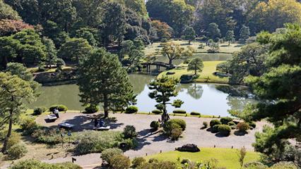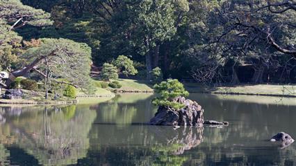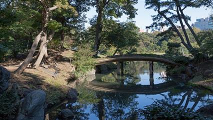 Indispensable à visiter le jardin de Rikugien un jardin de style Daimyo (seigneur féodal) avec l'esprit élégant de Waka (poésie traditionnelle japonaise). Fondé en 1702 par Yanagisawa Yoshiyasu confident fidèle du cinquième shogun Tokugawa Tsunayoshi. Le nom Rikugien se réfère à la classification de la poésie Waka dans le Kokin-shu (compilation impériale des Wakas éditée en 905). Le chiffre 6 qui se lit normalement "roku" en japonais est prononcé ici "riku" à la manière chinoise pour donner le nom de Riku-gien. Le pavillon de thé Tsutsuji-chaya construit en bois de rhododendron est l'un des rares témoignages architecturaux de l'époque Meiji. A côté du pavillon Takimi-chaya coule un petit ruisseau entre des roches, on y entend de subtiles touches sonores. Les Sekichu ou colonnes en pierre, 32 de ces colonnes subsistent sur un total de 88, désignaient les meilleurs points de vue sur le jardin. Horai-jima un minuscule îlot en forme d'arc inspiré par le Shinsen-shiso (notion taoïste) obéit au modèle Doukutsu-iwaguni (assemblage de pierres évoquant une grotte). Au sommet de Fujishiro-tog, la colline artificielle la plus haute du jardin (35 m), la vue sur le jardin est magnifique. Sasagani-no-michi un chemin aussi étroit qu'un fil d'araignée. Imo-yama et Se-yama les deux collines artificielles de l'île de Naka-no-shima sont la représentation allégorique de l'homme (Sé) et de la femme (Imo), une pierre Sekirei-ishi évoque le vieux mythe d'Izanagi et d'Izanami sur l'origine du Japon. Deshio-no-minato est l'endroit où la vue sur l'île de Naka-no-shima à droite, sur l'îlot d'Horaijima ainsi que sur la plage de Fukiage en face, est la plus belle. Naitei-daimon est la porte qui permet d'accéder au coeur du jardin.
