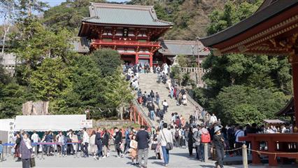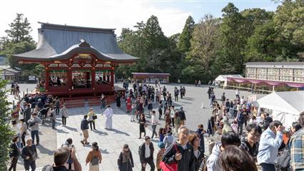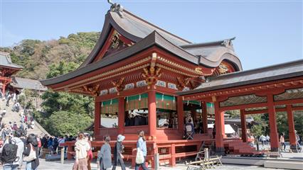 Ensuite nous remontons une rue piétonne étroite bordée de cafés, de restaurants, d'échoppes diverses, de boutiques souvenirs et finissons par croiser un Tori très haut qui marque l'entrée du sanctuaire Tsurugaoka Hachiman-gû fondé en 1063, dédié à Hachiman dieu de la guerre. Après bien des vicissitudes, il fut reconstruit en 1823 et depuis il abrite le musée des trésors nationaux avec une collection d'objets d'art religieux réalisés par des moines de Kamakura aux époques Kamakura et Muromachi.