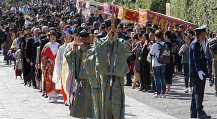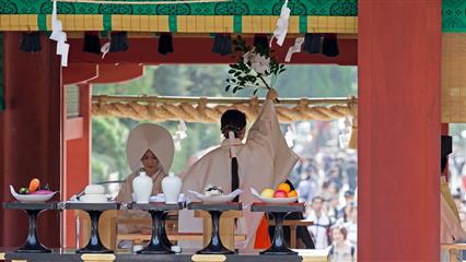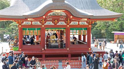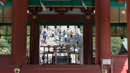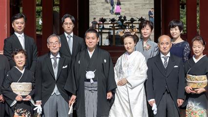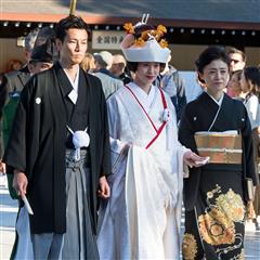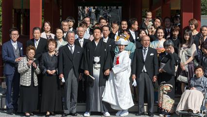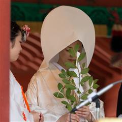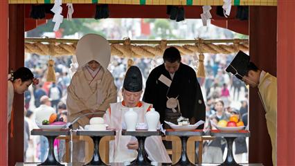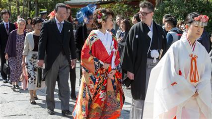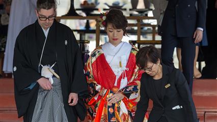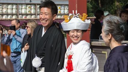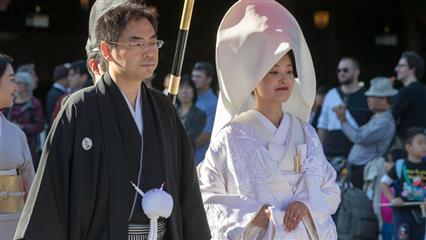 Nous avons eu la chance d'assiter à plusieurs mariages shintoïstes, mariages qui se déroulent en public dans un pavillon ouvert où seuls les mariés et leurs invités ainsi que les prêtres et servants ont le droit de se trouver, les musiciens qui enchantent la cérémonie de leur musique sont installés sur un rebord qui jouxte le pavillon.