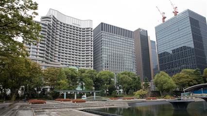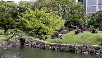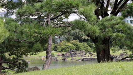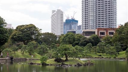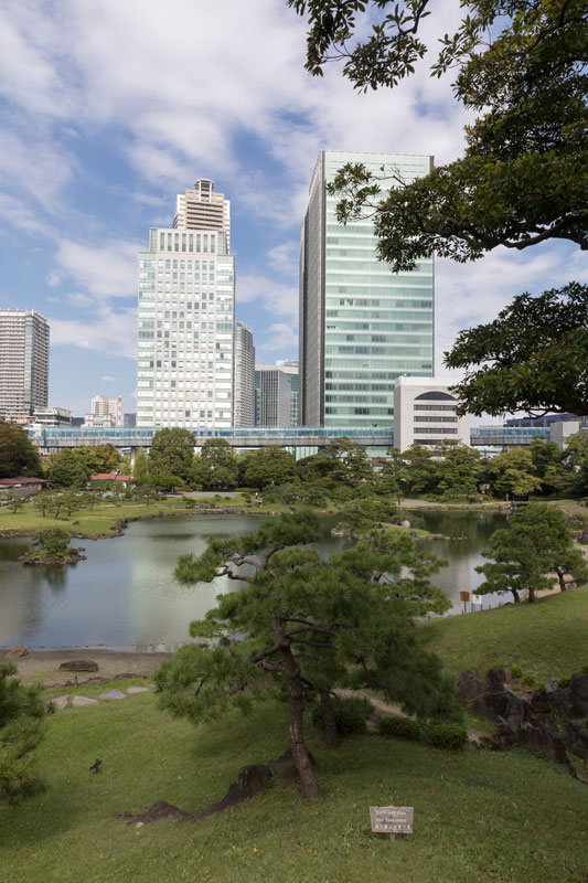 Le quartier n'a aucun intérêt, heureusement tout à côté, au milieu de ce modernisme bétonné, un jardin épargné par la frénésie immobilière, les séismes et les guerres, le jardin de Kyu-Shiba-rikyu offre un havre de paix. Typique de Daimyo (seigneurs féodaux) c'est l'un des plus anciens de l'époque Edo. Les éléments qui encerclent l'étang central et la minutieuse composition des rochers sont typiques du jardin dit de promenade paysager. Entre 1655 et 1658 un terrain gagné sur la mer permet à Okubo Tadatomo, haut fonctionnaire du shogunat Tokugawa, d'y faire élever en 1678 sa résidence. Pour élaborer, concevoir et construire son jardin, il sollicite, de son fief d'Odawara, des maîtres jardiniers. Il nomme ce jardin Rakuju-en. Ensuite ce jardin deviendra la propriété de diverses familles avant de devenir la demeure officielle des Kishune branche de la famille des Tokugawa. En 1875 l'Agence de la cour impériale rachète le domaine. L'année suivante l'ensemble prend le nom de Shiba-rikyu. En 1923 le terrible séïsme de Kanto détruisit la plupart des édificices et la végétation. La ville de Tokyo reprend le domaine à son nom en 1924 et l'ouvre au public. En 1979 le jardin est désigné comme site d'exception sous le nom de Kyu-Shiba-rikyu teien. De nombreux bancs et espaces aménagés couverts; à la mi-journée les Tokyoïtes viennent y prendre leur déjeuner.