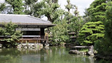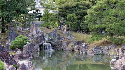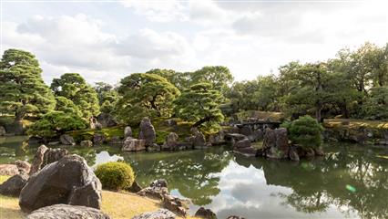 La porte qui garde l'entrée de la villa impériale est caractérisée par un pignon en arc à l'avant et à l'arrière du toit, la toiture de la porte est en écorces de cyprès. Appuyée sur quatre piliers la porte est décorée de gravures richement colorées de grues, de pins, de bambous et de fleurs de pruniers symboles de longévité. La présence de lions représente les gardiens du palais. Puis après avoir enlevé ses chaussures on pénètre à l'intérieur du Palais Ninomaru constitué de 6 bâtiments reliés et alignés le long d'une diagonale nord-ouest. 33 pièces occupent le palais, elles sont séparées par des portes coulissantes, 800 tatamis recouvrent le plancher . Les cloisons coulissantes sont décorées de magnifiques peintures (3600) de l'école Kano, de traverses richement sculptées, de splendides ferrures. A l'intérieur de l'enceinte deux jardins s'épanouissent. Le jardin Seiryu-en construit en 1965 associe un jardin japonais (le Koun-tei et son pavillon de thé Waraku-an) à un jardin gazonné de type ocidental. Le jardin Ninomaru a un étang au milieu duquel une île a été élevée c'est l'île du bonheur éternel, une seconde île de la grue à gauche, l'île de la tortue à droite..
