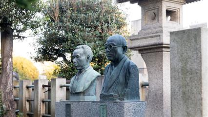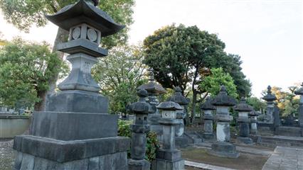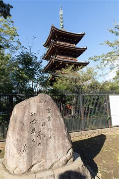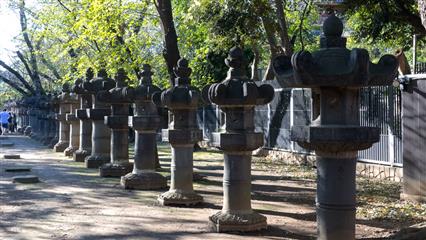 Un peu plus loin entre Ueno et Hongodai (descendre à la gare de Nishi Nippori) le quartier de Yanaka (Ya=vallée et naka=au milieu) situé dans une vallée, offre un petit coin paisible où temples et maisons de bois traditionnelles ont échappé aux ravages du XXème siècle. Le cimetière de Yanaka lieu de promenade prisé des tokyoïtes, plus particulièrement en avril à la floraison des cerisiers. Les pierres tombales y sont lustrées par le temps. Au nord-est du cimetière le temple Tenno-ji, connu pour son bronze de Bouddha, est dédié à Bishamonten une des 7 divinités de la Chance.