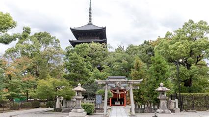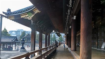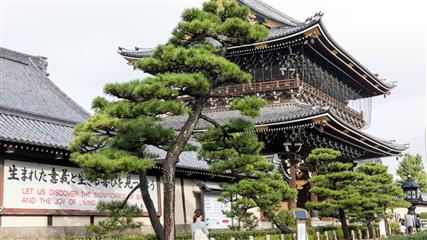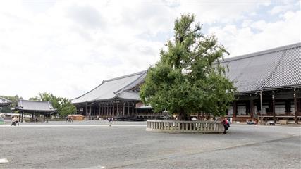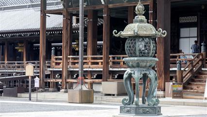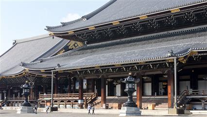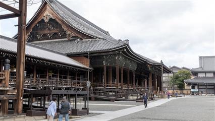 Le Nishi Hongan-ji fondé autour du mausolée de Shinran Shonin (1173-1262) fondateur de la secte de la terre pure. Il représente l’école bouddhiste Jôdo-Shinshû, aujourd’hui très populaire au Japon, créée par le moine Shinran. Le temple fut d’abord édifié à Osaka, puis déménagé et reconstrui à Kyoto en 1591. Le Goei-do est le bâtiment principal dédié au fondateur, achevé en 1636. Ses dimensions, 62 mètres de long par 48 mètres de large, en font un des plus grands bâtiments sacrés de la ville. Nombreuses salles de réception traditionnelles, avec tatamis et portes coulissantes. De superbes lanternes et des plafonds de bois sculptés. Le temple est classé au patrimoine mondial de l'Unesco depuis 1994. Le portail d'entrée Karamon date du 16ème siècle, la porte est décorée selon les codes de la période Momoyama, elle a été transférée au temple en 1618 depuis le château Fushimi. La cloche du temple est suspendue à l'abri d'une petite tour.