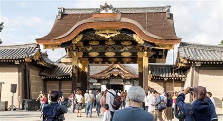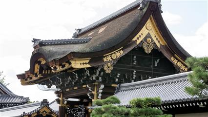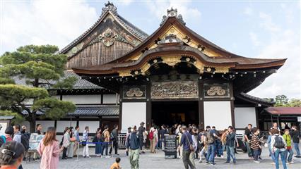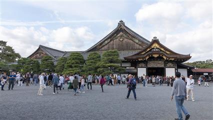 En fin de journée nous nous rendons au Château Nijo-jo inscrit au patrimoine mondial de l'Unesco en 1994. Demain le nouvel empereur sera intronisé à Tokyo, le château fait porte ouverte et l'entrée est gratuite. C'est la foule des grands jours. L'attente ne sera pas trop longue pour pouvoir rentrer dans le bâtiment. Mauvaise surprise interdit de prendre des photos : dommage.