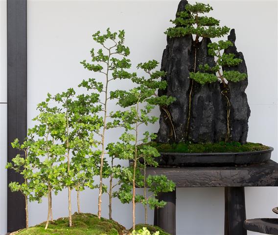 L'art du bonsaï à l'origine une technique chinoise développée au VIIème siècle sous la dynastie Tang. Les premières mentions de bonsaïs au Japon remontent à l'époque Kanamura. Au milieu du XVIIème siècle les jardiniers japonais améliorent la technique, comme l'art floral le bonsaï symbolise la relation de l'homme avec le ciel et la terre. Ils sont classés en quatre catégories : ceux à un tronc, ceux à troncs multiples, ceux composés d'une même espèce et ceux d'espèces différentes. Ils font l'objet de concours et d'expositions fréquentes très souvent dans l'enceinte des temples. Ce sont des arbres (bon) en pot (saï) nanifiés par le savoir-faire des hommes.