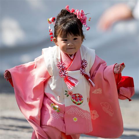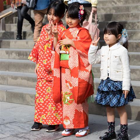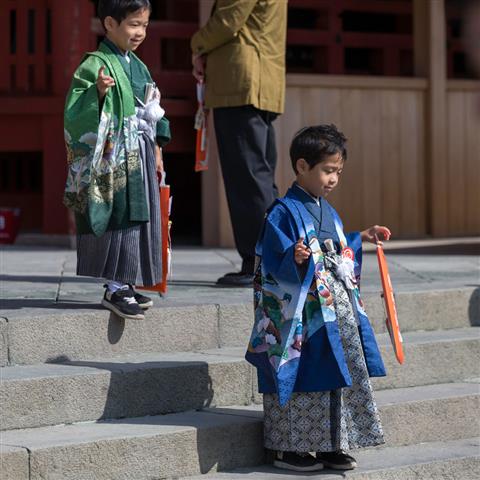 Les sanctuaires shintoïstes voient, le jour de la fête des enfants, une grande affluence de familles japonaises vêtues de leurs plus beaux atours (surtout les femmes) accompagnées de jeunes enfants vêtus de somptueux costumes traditionnels avec des sacs décorés de tortues ainsi que de longues confiseries qui symbolisent la longévité. En général, parents et grands-parents accompagnent l’enfant au sanctuaire shinto où est organisée une petite cérémonie tenue par un prêtre. Celui-ci bénit les bambins afin de leur assurer bonheur et santé. Les parents viennent prier et faire voeux de longévité et de bonne santé pour leurs enfants et aussi pour recevoir la purification des divinités. Cette fête traditionnelle se déroule habituellement le 15 novembre mais à tendance de nos jours à s'étendre tout au long du mois de novembre. Shichi-Go-San (littéralement « sept cinq trois ») est un rite de passage, pour les filles de 3 et 7 ans et les garçons de 5 ans.
