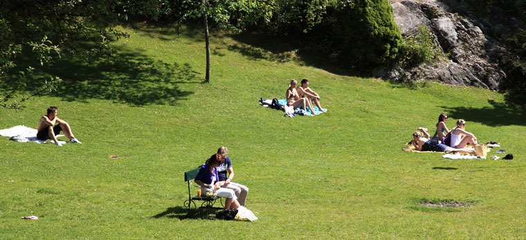 Le soir, si l’on peut dire, l’animation ne faiblit pas et les terrasses de café sont envahies autant par les touristes que les norvégiens. Un va-et-vient incessant de bateaux à moteurs, supérieurs en nombre aux voiliers, animent les bassins du port en permanence de la fin de l’après-midi à tard dans la nuit, accostant et repartant au gré de leurs fantaisies. Le vendredi soir et le samedi l’excitation est à son comble, la consommation d’alcool, quelles que soient les tranches d’âges, est démesurée, conduisant à des débordements pénibles.