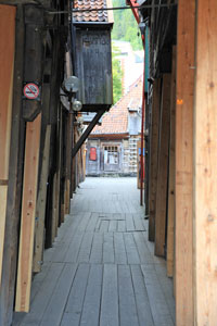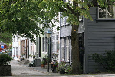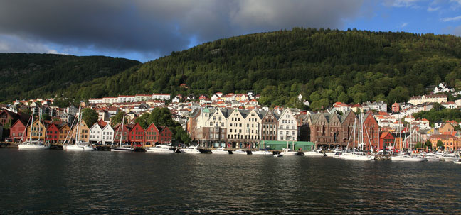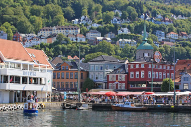 Le mont Fløyen domine la ville de ses 320 mètres. De son sommet, gravi à pied, la vue sur Bergen blotti dans son écrin de verdure, est imprenable. On embrasse un formidable panorama. Le Quartier de Bryggen, au pied du mouillage, est inscrit au patrimoine de l’humanité. Des passages entres les bâtiments, aux endroits qui ne sont pas encore restaurés, laissent apparaître les matériaux utilisés autrefois pour bâtir ces immeubles : soubassement en pierre surmonté de constructions en bois mal dégrossi. Plusieurs musées nous ouvrirons leurs portes à la découverte d’évènements historiques, culturels et artistiques qui nous sont mal connus. Les maisons en planches très colorées, partent à l’assaut des pans montagneux du fjord à l’intérieur duquel Bergen est établi. Ces maisons bordent les rues tortueuses, étroites et pentues, bien souvent encore dallées de pavés. De nombreux espaces verts disséminés dans la ville offrent aux habitants la possibilité de se réunir, assis à même le sol, voire de s’allonger en maillot de bain sur une serviette de bain comme à la plage.