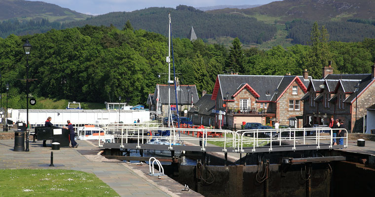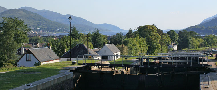 Finalement un individu longiligne, dégingandé, en tenue bleue marine accoutré d’une brassière rouge fait de grands signes en nous hélant. Les portes de l’écluse commencent à s’entrouvrir dans un grincement sourd. Le moteur est rapidement démarré, les amarres récupérées et Noème déhalé du ponton. La porte de l’écluse franchie Noème vient à quai de nouveau. L’éclusier fait signe de monter sur le quai et de le suivre à l’intérieur d’un bâtiment implanté en retrait du canal. Là il explique (dans un anglais teinté d’un fort accent écossais) les manutentions et manœuvres qui nous attendent pour franchir les écluses et les ponts tournants. A l’issue de son exposé il remet divers documents concernant la navigation sur le canal. Pour finir compléter une fiche signalétique et régler le montant des droits de passage qui s’élèvent pour notre bateau à la somme de 226 (£) livres Sterling. Une fois payé ce droit de transit il n’y aura pas de frais supplémentaires à acquitter. A l’image du premier éclusier, tout le long du parcours les autres seront obligeants et disponibles. Voilà enfin dans le Canal Calédonian dont nous avions si souvent parlé et à propos duquel nous avions lu nombre de récits. A quelques encablures de là, à Banavie, se dresse l'escalier de Neptune : huit écluses consécutives et une heure et demie pour les franchir dans un impressionnant dénivelé qui nous mène, par marche successive à 19,5 mètres au-dessus du niveau de la mer. Les portes autrefois manœuvrées à l’aide de cabestan par douze hommes, le sont aujourd’hui seulement par deux car équipées de vérins hydrauliques, ce qui a simplifié leur travail. La fin de journée s’annonce, aussi après avoir escaladé cette série d’écluses, l'heure de la débauche sonnera pour les éclusiers et pour nous.