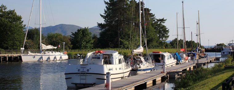 Juste après la dernière écluse le ponton de la marina de Banavie attend pour la nuit les yachts en transit. Un paysage d’une grande quiétude nous entoure. Une certaine sérénité règne sur cette portion de canal où, installés sur le quai à l’heure du thé, au milieu d’autres embarcations amarrées, sous un soleil rutilant, nous admirons les dernières neiges du Ben Nevis, cet ancien volcan à présent éteint.
