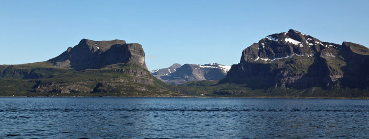 Quatre jours plus tard, alors que Bergen affiche 275 jours de pluie par an et que pour nous le soleil a continuellement brillé au cours l'étape, nous remonterons tout le littoral Norvégien jusqu’à Tromsø sous un ciel bleu azur et de journées qui n’en finissent pas. Les fjords, les mouillages et les ports se ressemblent étrangement. Le long du trajet pas de nette rupture du sud au nord dans les paysages grandioses, avec leurs sommets toujours enneigés en ce début d’été. La navigation dans et entre la montagne, parmi des parois montagneuses à la verticalité étonnante rejoignant la mer abruptement est étonnante.