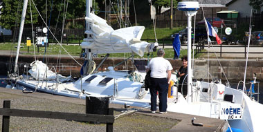 Le passage du canal n’est nullement difficile. Les manœuvres ne présentent aucune complexité particulière, même en équipage réduit. Des précautions sont à prendre par simple prudence. Bien protéger les flancs du bateau avec de bonnes défenses, avoir à disposition des amarres assez longues (elles passent en double sur des pontets situés sur le quai et reviennent sur le bateau) car le « marnage » peut atteindre 4 à 5 mètres, deux bonnes gaffes. De plus le personnel recommande le port de gilets de sauvetage, sans insistance. A deux reprises, les ailettes des quilles ont frotté sur la paroi verticale du quai car nous n’avions pas maintenu le bateau strictement parallèle à ce dernier. Par la suite nous faisions attention à bien le maintenir dans l’axe et ne pas rapprocher la proue du quai. Eviter si possible de se retrouver devant les portes de l’écluse au moment du remplissage car cela provoque l’apparition de grosses turbulences et de gros remous qui font danser la gigue aux embarcations. S’il se trouve plusieurs bateaux à écluser le choix de la place ne sera pas possible, les éclusiers les disposant en fonction de leur encombrement dans le bassin.