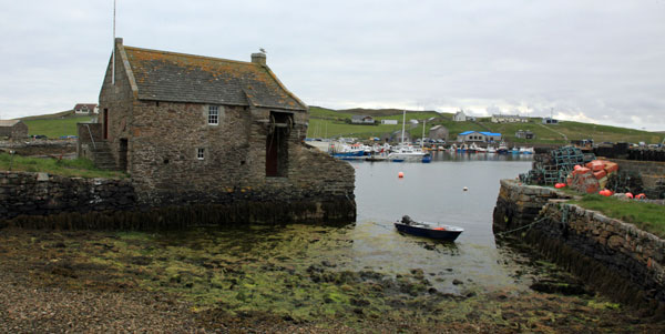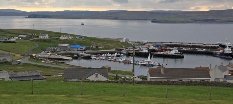 Toujours vent d'est pour monter sur Baltasound, un 5 établi et une mer belle. Temps un peu froid tout de même. Une agréable navigation entre les cailloux. Baltasound le port le plus nord de la Grande Bretagne (60°45.5'N 00°50.2'W) avec un bureau de poste lui aussi la plus nord du pays. Dès notre amarrage le "harbour master", plus britannique que nature (costume sombre strict et cravate club) arrive, nous souhaite la bienvenue et nous présente tous les attraits de son île. Dans la nuit le vent tourne au sud-ouest forcit 30 noeuds et nous voilà balloté gentiment pendant les 24 heures suivantes sur un petit ponton à peine plus long que Noème. Nous restons à bord car les pare-battages ont tendance à remonter sur le ponton et ce n'est pas une sinécure que de repousser le bateau et insérer à nouveau les protections entre la coque et le ponton. Pas de visite à terre pour cette fois-ci. Nous pensions traverser la mer du nord en direction de la Norvège ce jour mais nous nous attarderons une nuit de plus.