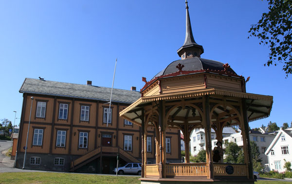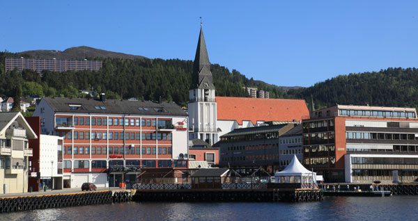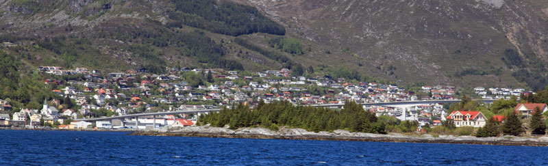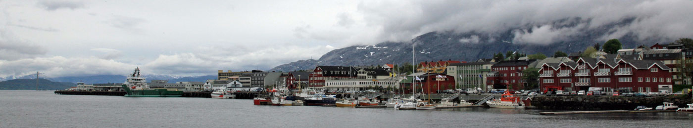 Promenade dans Sandnessjoen. Toutes les villes ont à peu près la même architecture. Le centre ville construit autour du port reste le centre d'activité principal avec ses immeubles modernes plus ou moins réussis. Les habitations de bois coloré construites autour du port sur les flancs de la montagne environnante. Une église toujours en bois, avec son cimetière attenant, décentrée et le plus souvent sur les hauteurs. Toujours au centre de nombreux bars avec terrasses dans lesquels se retrouvent et se regroupent les norvégiens dès l'apparition du moindre rayon de soleil.