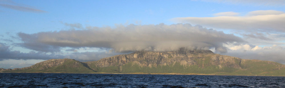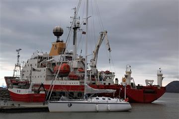 Il pleut toujours mais il faut progresser vers le nord. Nous avons un bon vent de sud-ouest de 25/30 nœuds, une mer rouleuse, une pluie froide et dense, une visibilité extrêmement réduite. Parfois, de loin en loin, au cours du trajet, des masses informes, floues surgissent de la brume et du rideau de pluie nous rappelant que les "cailloux" ne sont pas loin. 7,5/8 nœuds sous grand ‘voile seule à trois ris. Le yankee est enroulé et la trinquette affalée. Au plein vent arrière impossible de les tenir gonflées, ces deux voiles n'arrêtent pas de battre et de passer d'un bord sur l'autre suivant leur bon plaisir. S'écarter du vent arrière est toujours possible mais il faudrait empanner sans arrêt car les chenaux de la route intérieure ne sont pas très larges aussi continuons nous sous grand'voile seule. En fin de journée le vent passe à l'ouest et la trinquette est hissée. Le soir escale à Sandnessjoen complètement trempés. Le temps va encore se dégrader, un coup de vent est annoncé pour les prochaines 48 heures. Nous aurons le temps de tout faire sécher grâce au chauffage du bord avant de repartir.