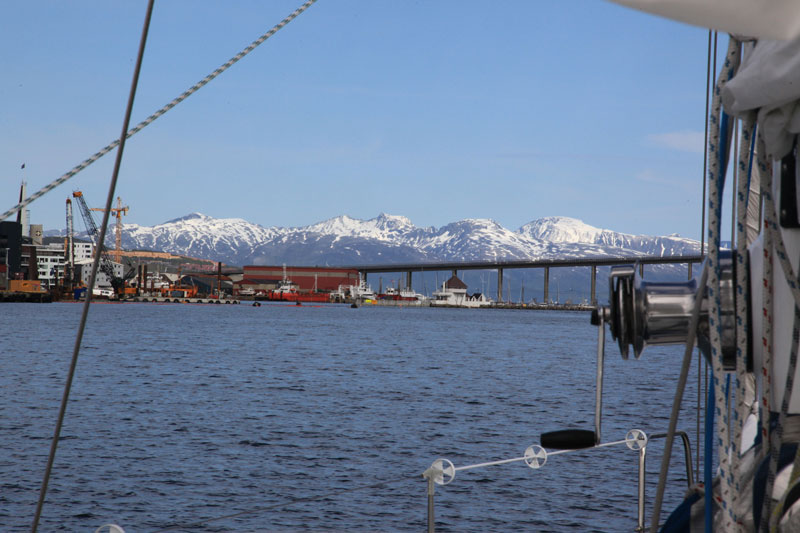 Tromso : "Paris du Nord", 69°40' nord. Dernière escale avant la traversée vers le Spitzberg. Tromso s'illumine sous le soleil à notre arrivée. Les montagnes environnantes très enneigées, la brise de nord-est qui se refroidie en passant sur la neige renforcent l'impression de froidure ambiante. Ici pas de nuit, le soleil passe ses journées sans fin au dessus de l'horizon. A minuit il scintille sur la mer qu'il embrase d'or, ou se teinte de rouge entre les montagnes (ce spectacle ne peut être apprécié que s'il n'y a pas de ciel couvert).