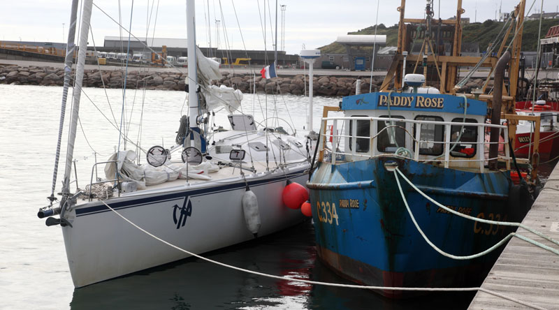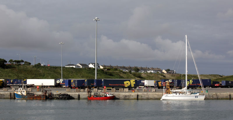 14 aoùt : Equipier récupéré à l'aéroport de Dublin la veille en fin d'après-midi. Départ pour Rosslare à la pointe sud-est de l'Irlande. Côte plate et monotone, bordée au large par des bancs de sable hérissés d'éoliennes. Cette descente vers le sud fut une succession de calmes et de coups de vent montant à 40 nœuds sous les grains. Rude mise en jambe pour notre fringant équipier. En soirée brise Volvo pour rejoindre Rosslare important terminal de ferries essentiellement dévolu au transport passagers et marchandises. Le site n'est pas très agréable mais permet de s'amarrer pour la nuit, avec l'accord du Harbour Master. Le ciel se dégage complètement en soirée et la nuit à couple de Paddy Rose, un coquillier en bien mauvais état, sera étoilée et fraîche.