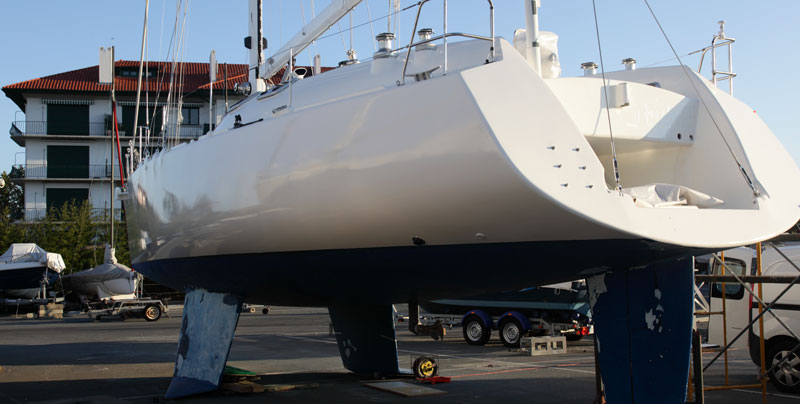 En effet après un peu plus de 10 000 milles en 3 étés et deux hivers la coque avait besoin de quelques retouches. La peinture ayant elle aussi souffert une remise en état était necessaire. Le revêtement de pont a lui mal vieilli, il s'encrasse très facilement et il est difficile de le nettoyer correctement. Il conserve un aspect gris sale en permanence. La solution a été de repasser une couche de peinture polyuréthane dans laquelle de la bille de verre a été mélangée au préalable. Pour le résultat anti-dérapant attendre les prochaines navigations.
