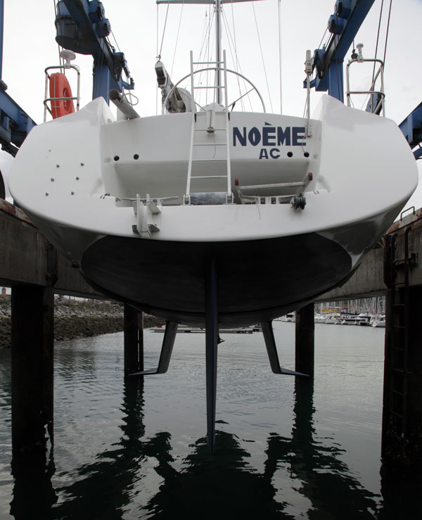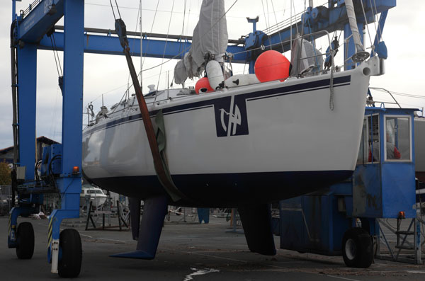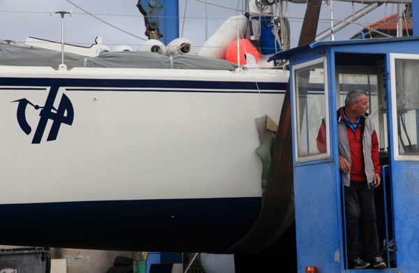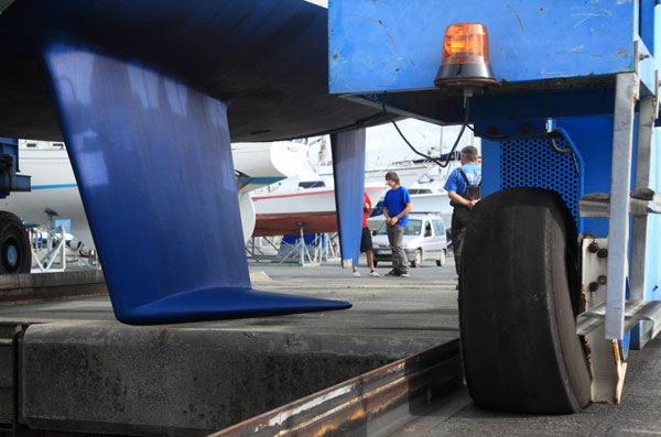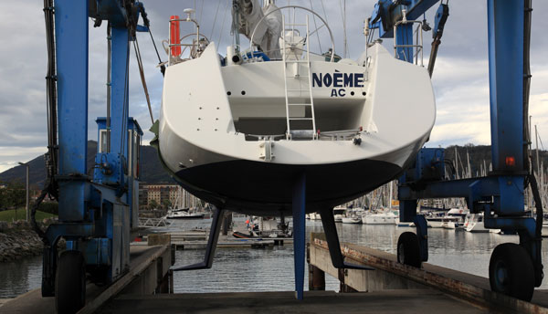 Noème est dans ses sangles, le grutier surveille. Noème s'approche de la fosse et tout s'immobilise. Le travelift a déjanté, le grutier stoppe l'engin. On regarde de plus près. Exact : déjanté (la roue bien sûr). Immobilisation juste à cheval sur la fosse : impossible de descendre le bateau, impossible de reculer. Que faire! Réunion de crise en urgence.
