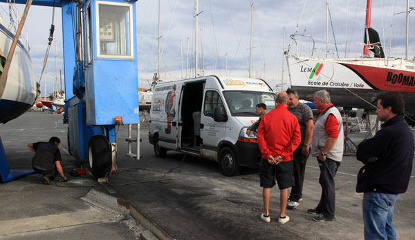 Finalement appel d'un réparateur espagnol équipé pour manutentionner les gros poids lourds. A son arrivée impossible de faire démarrer le moteur du travelift. Donc appel d'un mécanicien. Celui-ci arrive, regarde, ne le fait pas redémarrer et repart parce qu'il a autre chose sur le feu. Finalement un diéséliste qui a son atelier à côté de la zone technique règle le problème. La grue recule avec mille précautions Noème est posé sur le sol. Maintenant on peut s'occuper du pneu. Changé en 10 minutes.