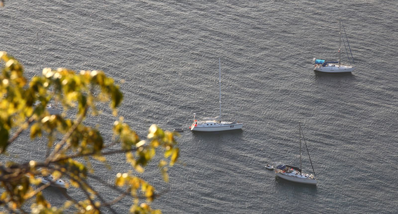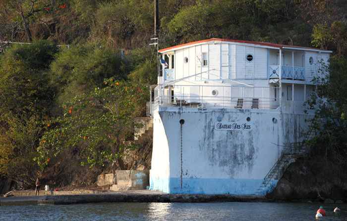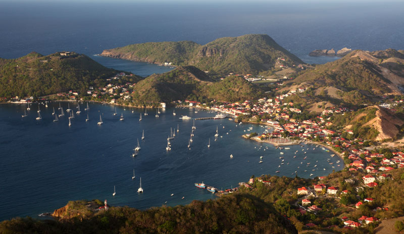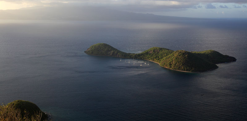Navigation dans l'archipel, enfin! Surtout Les Saintes : paysage splendide, eau transparente et turquoise. Au mouillage du Pain de Sucre la plongée se fait dans un véritable aquarium : sublime. La baie de Terre-de-Haut est classée comme une des plus belles baies du monde, cette opinion n'est nullement usurpée. Le mouillage très bien protégé (au point que Anglais et Français se sont disputés sa possession pour bénéficier de cet excellent abri pour leur flotte; la bataille des Saintes en 1782 en est un des nombreux épisodes) est maintenant organisé sur bouée depuis un an environ. Il n'est plus possible d'y jeter l'ancre sauf autorisation spéciale. Cela aura au moins l'avantage de protéger enfin les fonds. Les voiliers sont nombreux à venir ancrer et les fonds sont malheureusement détruits.