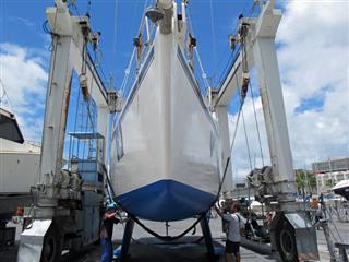 Après les premières réparations, Noème est mis au sec pour refaire la peinture sous-marine, vérifier le sail-drive ainsi que l'hélice. La coque n'était pas très sale (sauf sous les ailettes où pendaient de longues algues cet endroit est toujours difficile à nettoyer lorsque le bateau est au sec) mais la présence d'un travelift et un prix plus que correct nous ont incités à sortir le bateau pour caréner d'autant plus qu'à l'équateur les coques se salissent très vite. Cinq jours plus tard le bateau était de nouveau à l'eau avec un antifouling toute neuf.