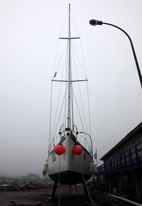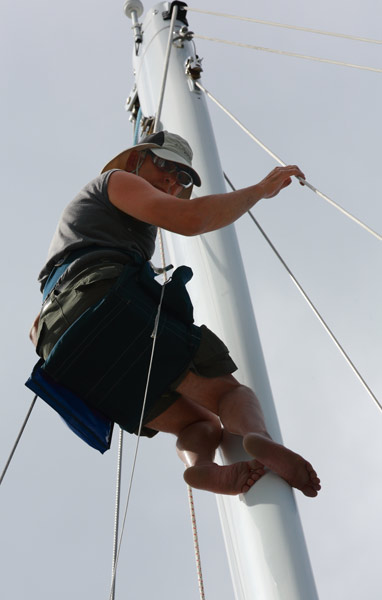 Antifouling bien sûr, skeg de protection du saildrive, installation d'un nouveau pilote, contrôle des voiles et quelques réparations y compris les divers tauds, vérification de l'électronique. Voiles gréées à l'occasion d'une accalmie matinale avec un petit tour au sommet du mât pour installer un nouveau messager pour la drisse de yankee qui avait disparu. Une garcette bien plombée et un crochet à passer par le passage de drisse en pied de mât et la drisse de yankee était de nouveau en place. Cela a été l'occasion de vérifier le gréement dans son ensemble : pas de gendarme.
