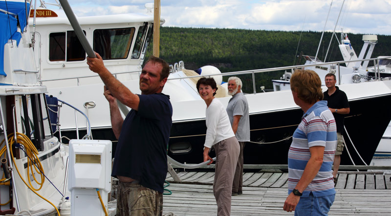 17 juillet : Plusieurs personnes viennent nous donner un coup de main pour descendre l'enrouleur et l'étai. Un "interprète" dénommé Peter lui aussi est présent pour pallier à nos insuffisances en langue anglaise, d'autant que les Terres-Neuviens parlent anglais comme les Québécois, s'expriment en français avec des expressions locales typiques et un accent à couper au couteau.