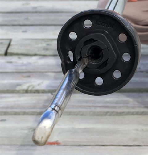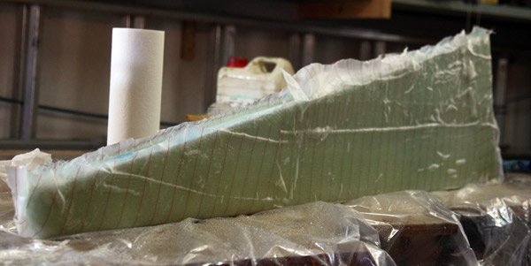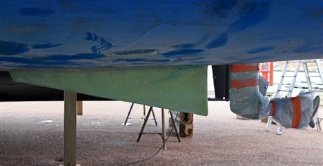 20 avril : Pour protéger le saildrive qui semblait vulnérable pour nos prochaines navigations, nous avons fabriqué un déflecteur à installer devant le saildrive pour éviter, dans la mesure du possible, que des glaçons malicieux ne viennent le bousculer. Mais les conditions météorologiques sont encore largement défavorables au travail de l'époxy. Lundi matin petite averse de neige, réchauffement dans l'après-midi à 2°C. Mardi pluie et vent, mercredi même temps et plus de vent. Heureusement que nous disposons d'un garage de surcroît chauffé, ce qui a bien facilité la réalisation de la pièce et aucun souci pour la polymérisation de l'époxy.