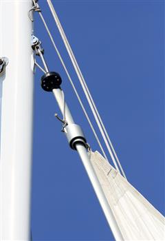 5 juillet : Le yankee est installé sur l'enrouleur pour essayer de comprendre ce qui a pu se passer. La drisse se met à tourner autour de l'étai dès le premier tour, impossible d'enrouler. Ca coince. Le yankee est malgré tout laissé en place le temps de sécher avant de l'affaler et de le ranger. A première vue le curseur-émerillon ne tourne plus vraiment correctement. Nouvelle expédition en tête de mât. En plus des dégâts déjà constatés le haut du tube de l'enrouleur est écrasé, à changer lui aussi. Effectivement le curseur-émerillon ne joue plus son rôle, le frottement entre les deux parties (la mobile et la fixe) est trop forte, les roulements se sont dégradés.