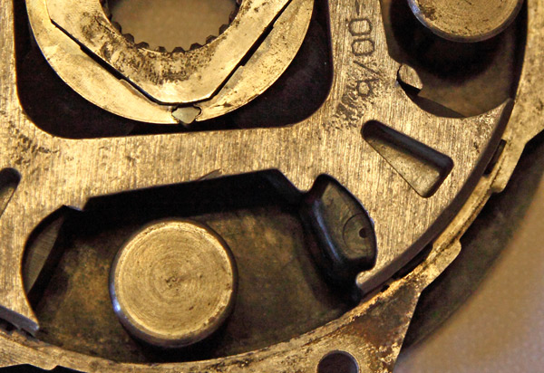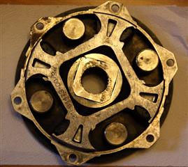 Comme un tas de pièces sont démontées on les examine, histoire de voir comment elles sont construites. Pour le dumper (accouplement souple) il y a quelque chose de bizarre, mais oui le métal est fendu et même il en manque un petit bout et le caoutchouc parait avoir souffert. Voila une belle surprise.