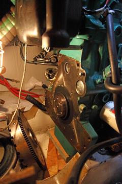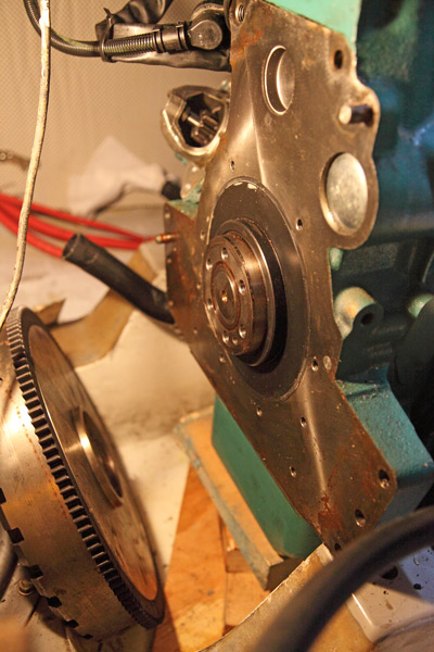S'installer confortablement dans le fonds de la câle, ajouter une baladeuse pour bénéficier d'un peu de lumière (quand on déteste la mécanique on en manque toujours) et commencer à démonter d'abord le carter du volant moteur, puis l'accouplement souple, dévisser le volant moteur lui-même puis l'extirper de son logement sans le laisser tomber au risque d'endommager la couronne de démarreur, pour finir dévisser une dernière tôle : apparait alors le presse-étoupe de l'arrière du vilbrequin qui est censé fuir et qu'il est nécessaire de changer selon le diagnostic posé à Halifax.