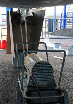 Jeudi grand beau temps, pas un seul nuage mais une température basse très basse : 1°C. Comment stratifier ce déflecteur? Avec grande gentillesse George de l'école de voile nous propose un bon gros chauffage au fuel. Stratification effectuée dans les meilleures conditions possibles donc. Grâce à la chaleur, la polymérisation a bien eu lieu. Hier, premier enduit de finition et bien sûr chauffage sous un petit crachin type "Breton".