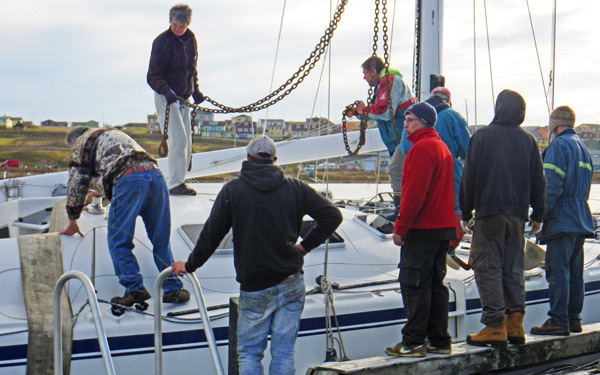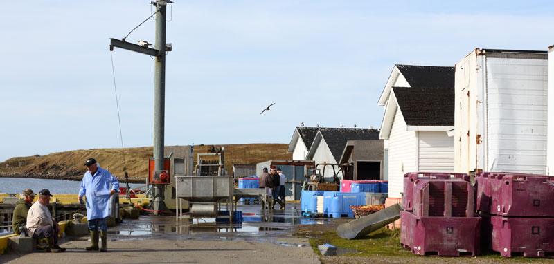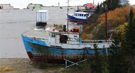 Dès l'accostage, les employés de l'usine de transformation de poisson, une des rares encore en activité, viennent prendre nos amarres et nous annoncent que la tempête de sud-est sera bien là demain et que le port est bien protégé. Les quais sont en bon état, l'usine active et les villageois diserts et aimables. Malheureusement l'activité principale de l'usine est de traiter du saumon d'élevage qui arrive par camions. Où sont les pêches d'antan?