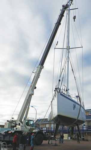 Les deux voiliers ont été levés en deux heures. Vite fait bien fait. "Quinquin", surnom du grutier, commence à avoir l'habitude de ce genre de levage. Et bien sûr merci à Manu et Christine de l'école de voile pour leur coup de main. Noublions pas Alain Menu ainsi que Danielle la secrétaire de l'école de voile qui devrait nous remettre une petite vidéo de l'évènement.