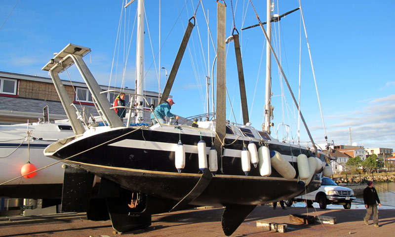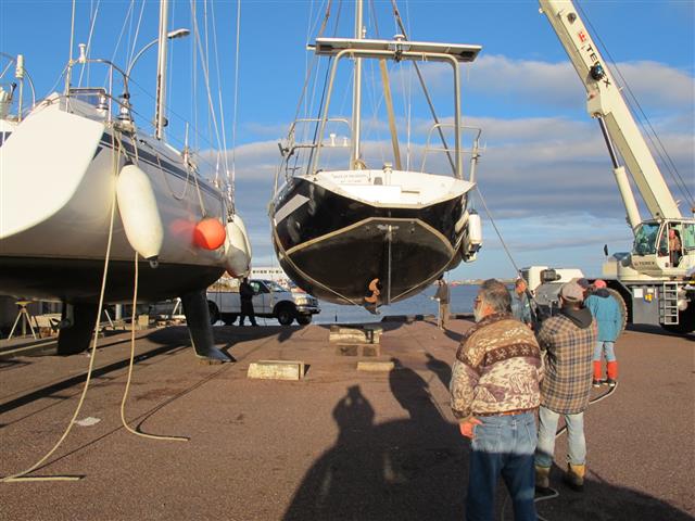 8 novembre : Les rares belles journées, depuis notre retour à SPM, nous ont quand même permis de préparer le bateau à son hivernage en particulier sécher les voiles ainsi que les cordages. Aujourd'hui nous avons pu mettre Noème au sec au même endroit que l'an passé. Un second voilier va aussi hiverner à côté de Noème : Back of the Moon, un Maracuja qui a déjà hiverné ici il y a une quinzaine d'année.