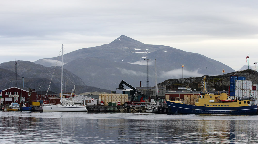 23 juillet : Dès l'ouverture des bureaux nous étions à la capitainerie pour savoir où nous pourrions nous amarrer sans gêner. Dialogue difficile avec un commandant du port qui parlait plus le groenlandais que l'anglais, heureusement qu'un jeune Groenlandais, employé du port, passait par là. Grâce à lui nous avons pu communiquer avec le responsable du port qui nous a attribué une bonne place où nous avons pu rester le temps de notre séjour.