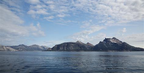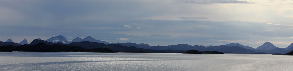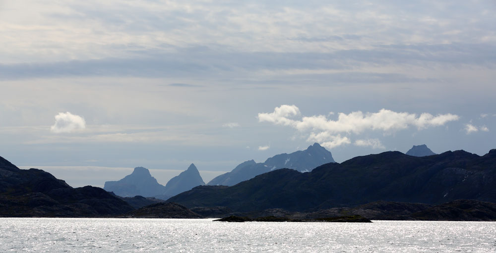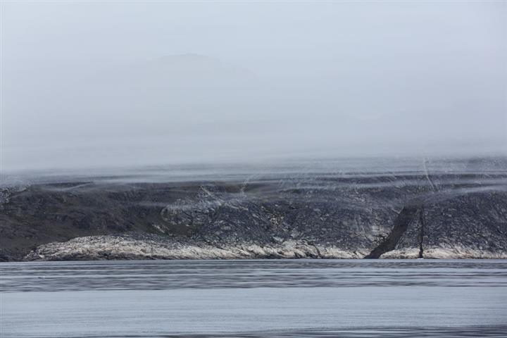 22 juillet : Des bancs de brume et derrière, un soleil qui éclaire de ses premiers rayons un cadre magnifique. Nous pouvons voir quelques oiseaux que jusque là nous n'avions qu'entendu. L'ancre remontée nous quittons notre petit havre, direction la route intérieure. Il y aura moins d'icebergs mais la route n'en sera pas exempte. Bien sûr ce ne sera que du moteur mais le paysage est grandiose, impressionnant dans ses dimensions et comme la brume ce matin a disparu, il se laisse contempler, cela fait oublier la pollution sonore du moteur. Trajet magnifique, le village coloré d'Arsuk se découpe sur la côte au pied d'une majestueuse montagne. C'est beau tout simplement. Ce petit village tourné vers la pêche possède une petite auberge même si le tourisme y est peu développé.Tard dans la soirée nous essayons de trouver un bon mouillage pour passer la nuit. Difficile de trouver. Deux d'entre-eux situés en face de petites communautés installées dans de tout petits villages colorés et entourés de nombreuses antennes diverses étaient envahis par les glaces. D'autres n'étaient pas conformes aux cartes en dimension et surtout en profondeur. Les cartes (y compris électroniques) ne sont pas d'une précision extrême, alors toujours redoubler de précaution et activer son sens crtitique au mieux pour ne pas faire de bêtises car ici vous êtes tout seul, c'est le grand vide, on ne peut que compter sur soi.