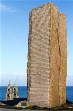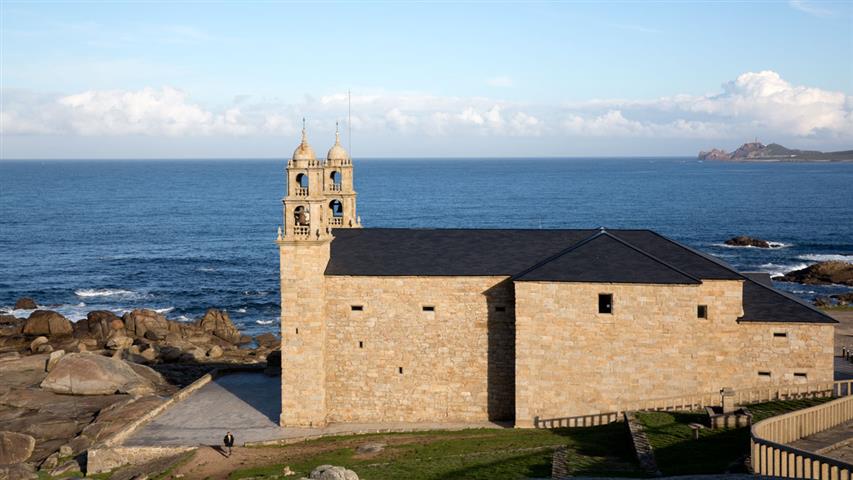 Du coup nous nous dirigeons vers Muxia un petit port de pêche et de plaisance situé au sud de Camarinas. Sur cette Costa da Morte (côte de la Mort), Muxía est un lieu emblématique : « Tout meurt à Finisterre, tout renaît à Muxía » assure le dicton. Selon la tradition, la Vierge Marie serait arrivée ici en barque de pierre, guidée par des anges, pour encourager l’apôtre Jacques à évangéliser la Galice. Le sanctuaire de Nosa Señora da Barca (Notre-Dame-de-la-Barque), au bord de l’océan, a été érigé pour commémorer cet épisode. Il aurait été construit à l’initiative des comtes de Monforte (dont les tombeaux se trouvent à l’intérieur du sanctuaire). Deux pierres symbolisent cette apparition : la Pedra de Abalar et la Pedra dos Cadris (représentant respectivement la barque et la voile du navire). On leur attribue des propriétés miraculeuses pour traiter les maladies rhumatismales.