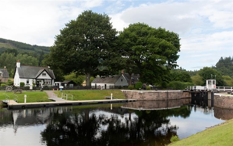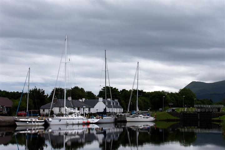 21 juillet : Rassurés quant au trouble du moteur, profitons du passage du canal. Mais bon il pleut, il fait froid, il fait humide dans le bateau. Une bonne raison pour que l'Ecosse soit verte. Malgré tout le canal reste agréable avec ses beaux paysages, son calme et sa tranquillité, la gentillesse des éclusiers, la rencontre et les échanges (en anglais of course) avec d'autres équipages de toutes nationalités. Pour la première nuit arrêt à Dochgarroch le long d'un grand ponton, près de la rivière Ness qui coule à grand renfort de courant. Vrai gazon anglais bien moelleux le long des berges, gazon entretenu par les éclusiers . Des maisons anciennes aux jardins fleuris. Des hirondelles qui virevoltent dans tous les sens. Un silence, un calme idyllique.
