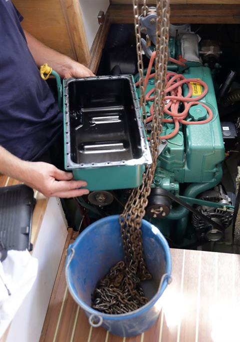Là nous avions pris rendez-vous chez Gwen Marine, concessionaire Volvo Penta, le moteur a une fuite d'huile conséquente. Le diagnostic du motoriste est que le joint de carter est fichu (moteur à 900 heures) et il faut le remplacer. Une panne qu'à priori il n'a jamais rencontré. Donc cela voulait dire : désaccoupler et sortir le moteur pour changer ce fichu joint. Heureusement que nous avons eu à faire à de bons professionnels. Mais en cette période les motoristes avaient beaucoup de travail et nous n'avons pu repartir que le 3 juillet.