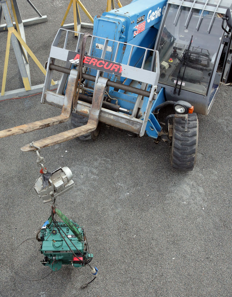 18 mars : Le moteur a été retiré de son ber pour laisser sa place à un nouveau moteur qui sera mis en place dans quelques jours. Comme il ne passait par le capot de descente il a été nécessaire de le réduire en volume pour cela certaines parties ont été ôtées : cloche et volant moteur, pompe à eau, coude d'échappement, alternateur.... Puis une fois le moteur retiré la sail drive a été désacouplé pour pouvoir être sorti du support.