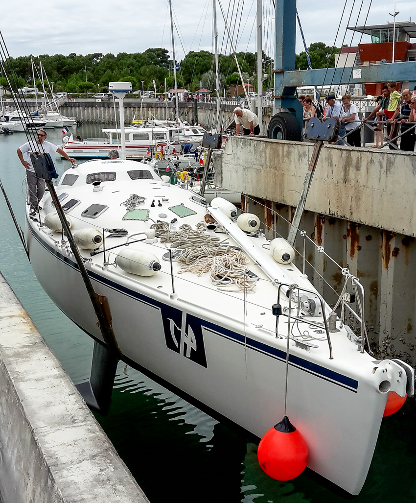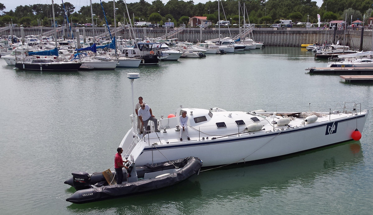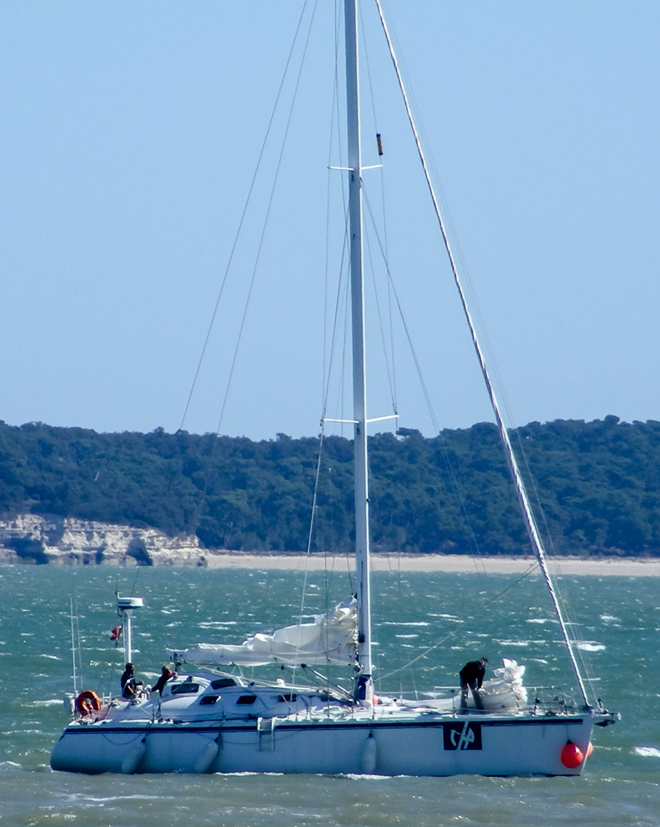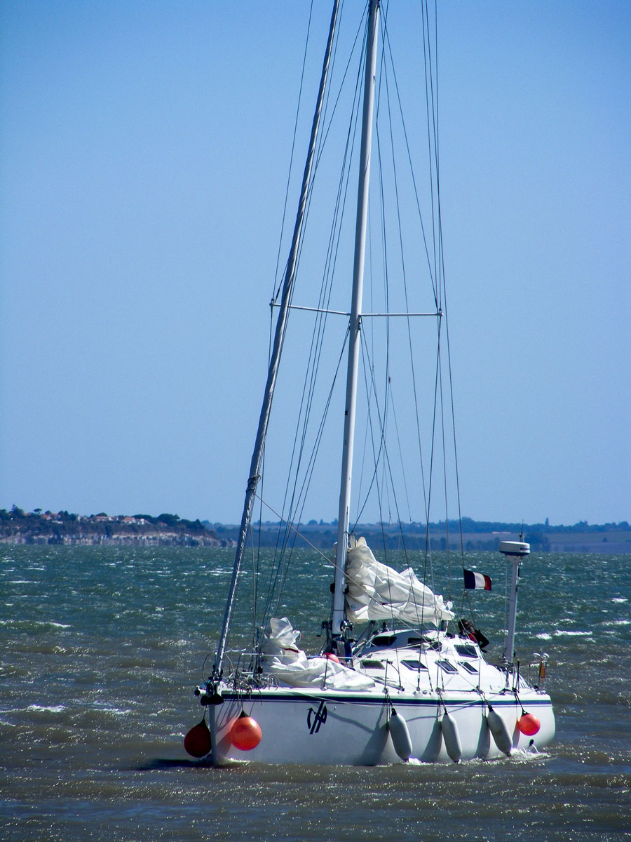 -Réglage du haubannage et mise en place des voiles (nouvelle grand-voile et nouvelle trinquette) avec comme surprise un enrouleur complètement bloqué. Jérôme Dupin, le voilier de Star Voiles qui venait livrer des voiles sur Port Médoc, a passé deux heures sur Noème pour essayer de résoudre ce bloquage. Finalement il s'est avéré que la pièce en matière plastique, guide de la bosse d'enrouleur, avait pris du volume au cours du temps et elle bloquait la poulie crantée. Après une cure d'amaigrissement à la meuleuse la poulie crantée retrouvait sa fluidité.
