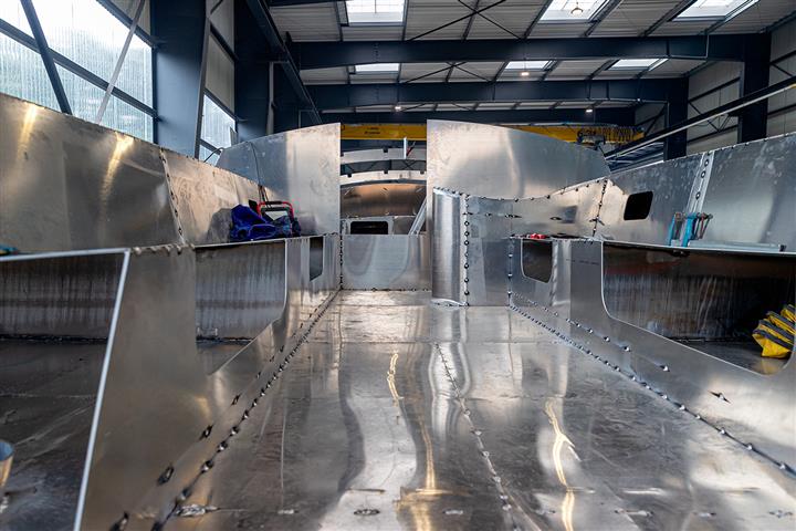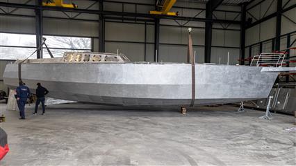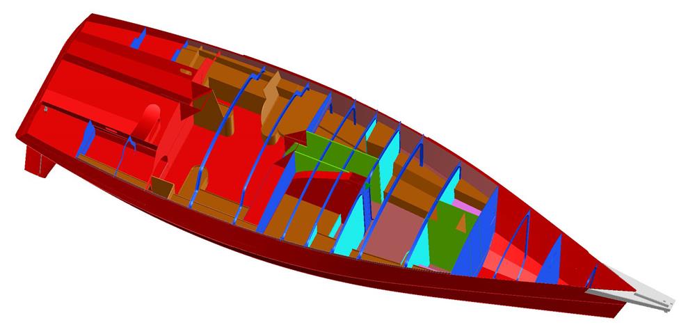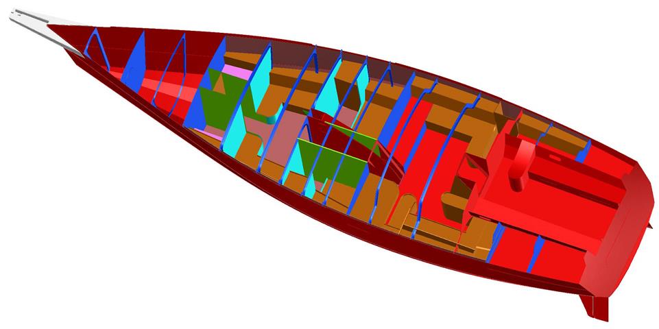 La construction progresse. Mise en place des ailerons de safrans, des tubes d'étambot, cockpit et siège du barreur,divers compartiments sur l'arrière.